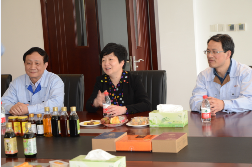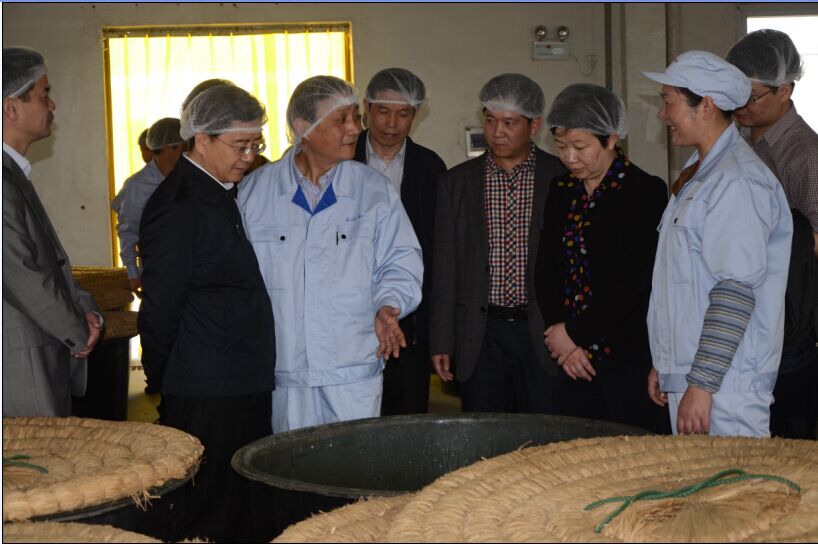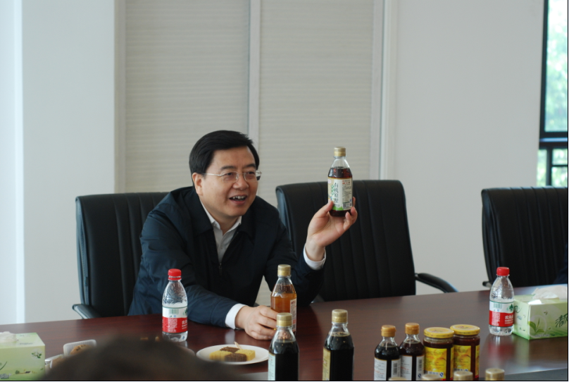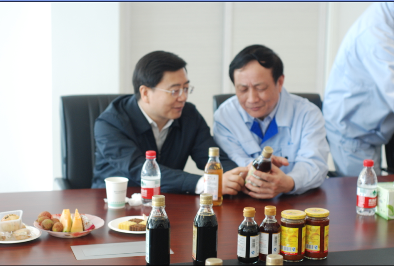 陳偉俊市長一行參觀了公司醬油廠、醋廠,饒有興致地聽取公司技術人員關于醬油、食醋的生產工藝介紹。隨后,陳偉俊市長一行與公司班子成員座談交流。會上陳市長仔細了解了公司產品,品嘗了新品綠豆糕后贊不絕口;當得知食醋和酒一樣也有度數時,更是引起濃厚興趣,詢問公司的醋能做到幾度;在觀摩有機醬油新產品時,他提出現在市場上醬油品種繁多,消費者改怎樣區分醬油品質的好壞。公司領導既專業又通俗易懂地一一回答了陳市長的提問。陳市長還詳細了解了公司經營情況以及工藝技術創新、人才引進等方面存在的困難和要求,并就抓好當前生產經營、食品質量安全提出要求。